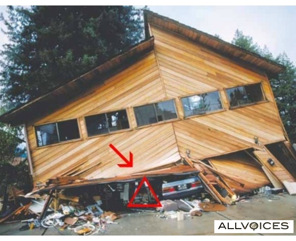 Simply stated, when buildings collapse, the weight of the ceilings falling upon the objects or furniture inside crushes these objects, leaving a space or void next to them - NOT under them. This space is what I call the 'triangle of life'. The larger the object, the stronger, the less it will compact. The less the object compacts, the larger the void, the greater the probability that the person who is using this void for safety will not be injured. The next time you watch collapsed buildings, on television, count the 'triangles' you see formed. They are everywhere. It is the most common shape, you will see, in a collapsed building.